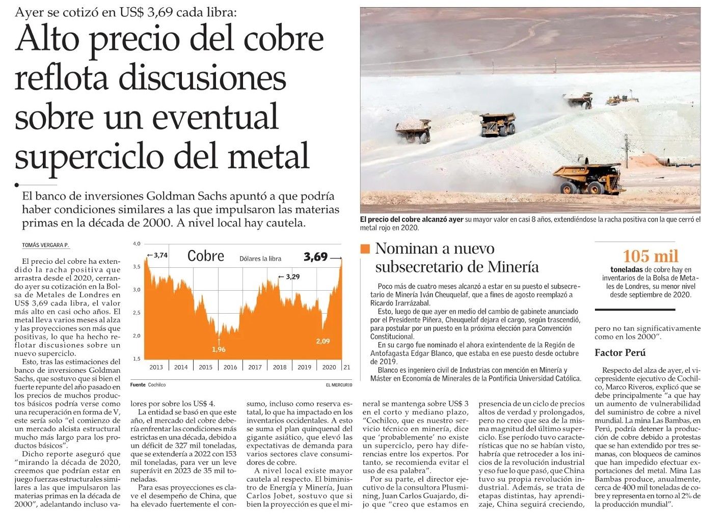 El precio del cobre ha extendido la racha positiva que arrastra desde el 2020, cerrando ayer su cotización en la Bolsa de Metales de Londres en US$ 3,69 cada libra, el valor más alto en casi ocho años. El metal lleva varios meses al alza y las proyecciones son más que positivas, lo que ha hecho reflotar discusiones sobre un nuevo superciclo.