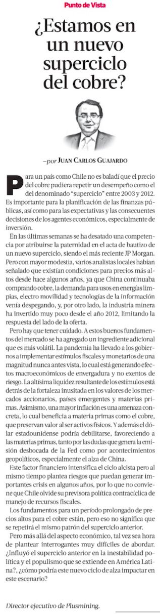 Para un país como Chile no es baladí que el precio del cobre pudiera repetir un desempeño como el del denominado “superciclo” entre 2003 y 2012. Es importante para la planificación de las finanzas públicas, así como para las expectativas y las consecuentes decisiones de los agentes económicos, especialmente de inversión.
