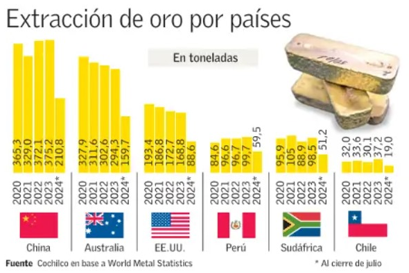 Si bien en el pasado, Chile fue un actor relevante en esta industria, ubicándose en el top 10 de productores a nivel global, hoy representa poco más del 1% del mercado, que es liderado por China y Australia (ver gráfico). En lo que va del año, según cifras de Cochilco al cierre de agosto, último dato disponible, se han producido 21 mil kilos de oro en el país, lo que representa un 8% menos de lo visto un año atrás en el mismo lapso.