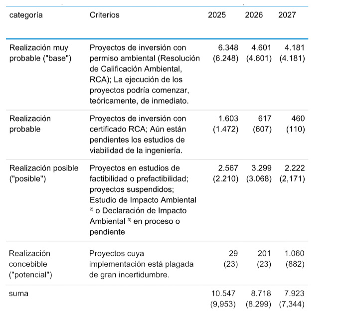 Así lo demuestra un panorama de Cochilco, empresa dependiente del Ministerio de Minería: solo en 2025 considera probables inversiones por casi 8 mil millones de dólares estadounidenses (US$), según su página web. Esta suma es resultado de proyectos cuya realización la compañía considera muy probable y probable. La mayor parte proviene de la minería del cobre, corazón de la minería chilena. Cochilco también espera altas inversiones en los próximos años, ya que el sector anticipa una creciente demanda de cobre y un alza en los precios del metal rojo.