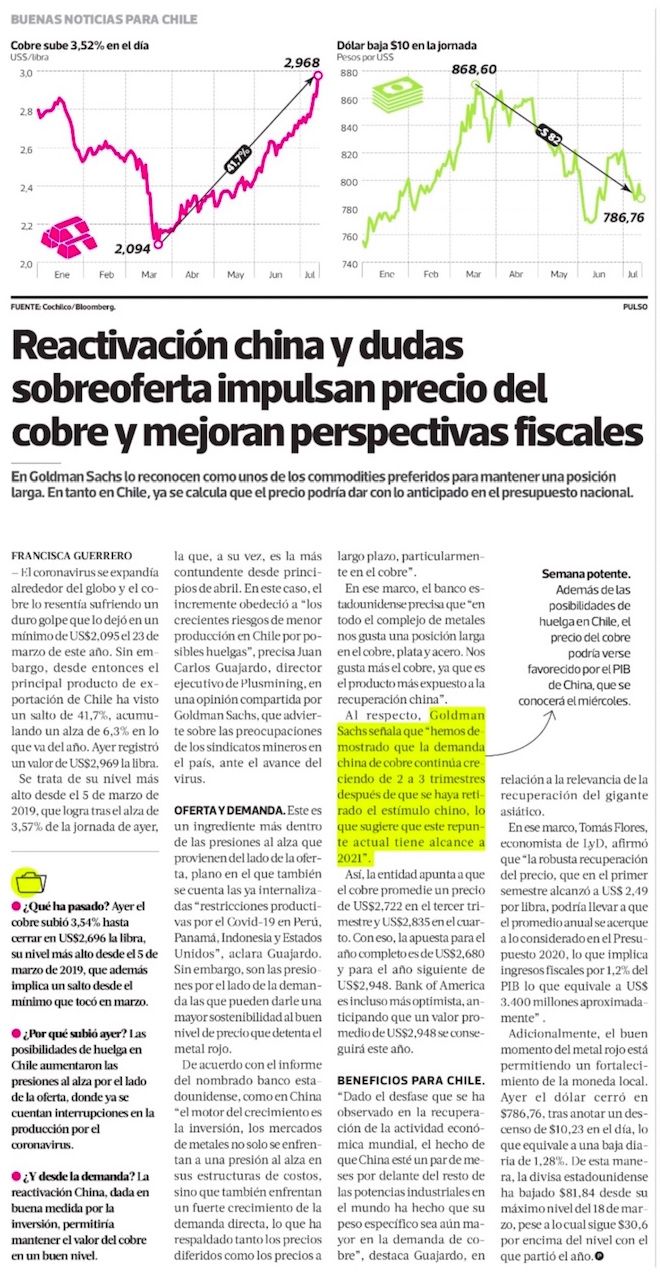 This is its highest level since March 5, 2019, which it achieved after the 3.52% rise in trading on Monday, which, in turn, is the most forceful since early April. In this case, the increase was due to “the growing risks of lower production in Chile due to possible strikes,” says Juan Carlos Guajardo, CEO of Plusmining, in an opinion shared by Goldman Sachs, which warns about the concerns of mining unions in the country, faced with the advance of the virus.