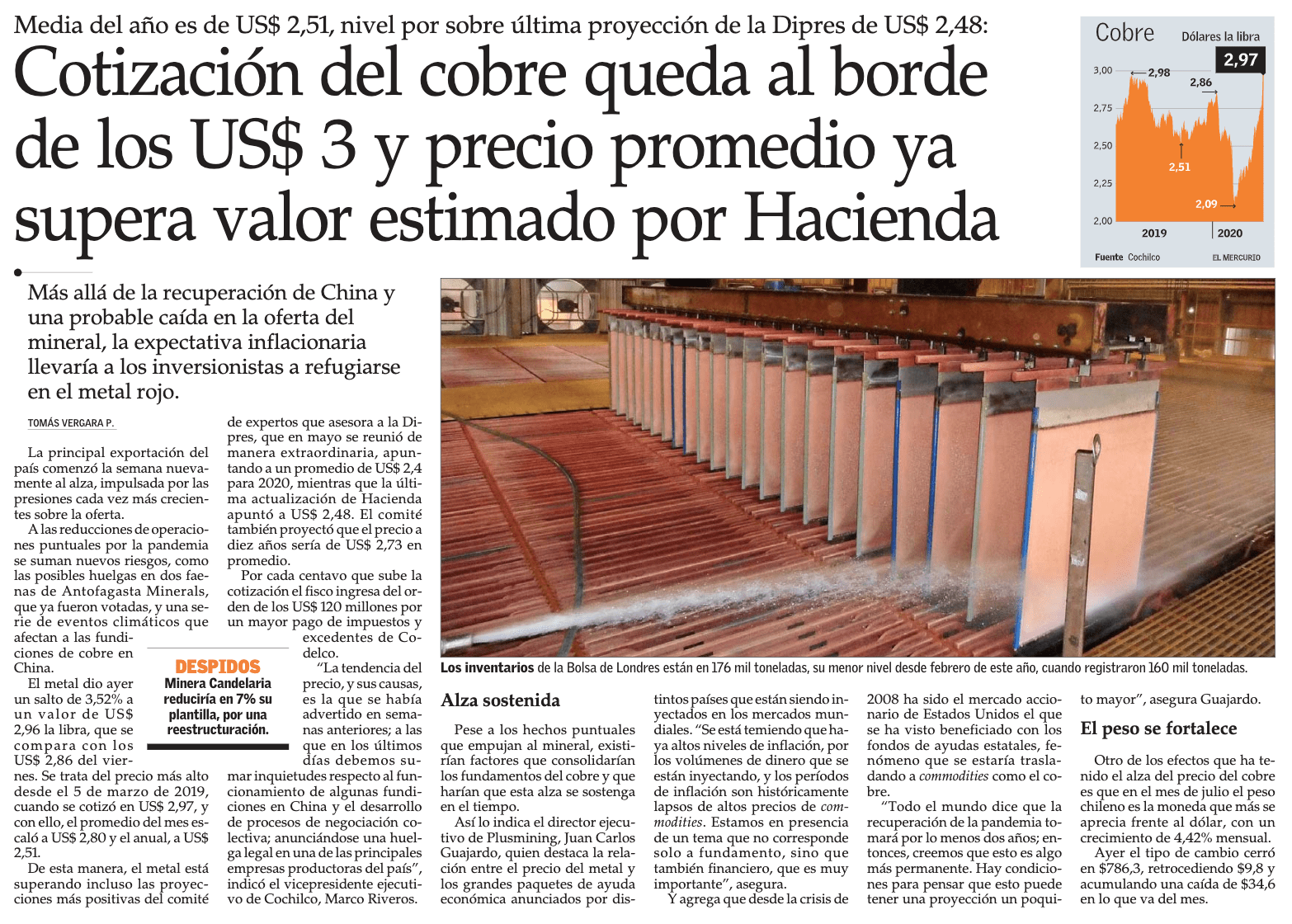 Home » El Mercurio » Copper price is on the verge of US $ 3 and the average price already exceeds the value estimated by the Ministry of Finance