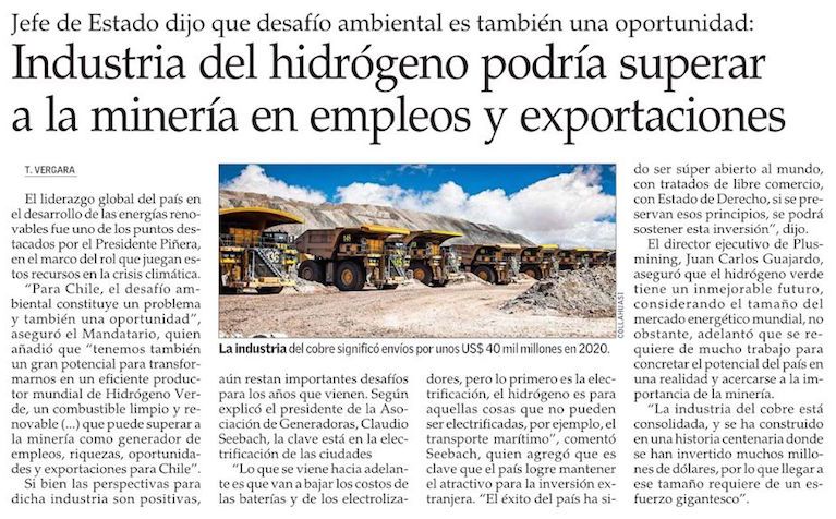 “The country’s success has been to be super open to the world, with free trade agreements, with the rule of law, if those principles are preserved, this investment can be sustained,” he said. The executive director of Plusmining, Juan Carlos Guajardo, assured that green hydrogen has an unbeatable future, considering the size of the world energy market, however, he advanced that a lot of work is required to make the country’s potential a reality and get closer the importance of mining. “The copper industry is consolidated, and has been built on a centuries-old history where many millions of dollars have been invested, so reaching that size requires a gigantic effort.”